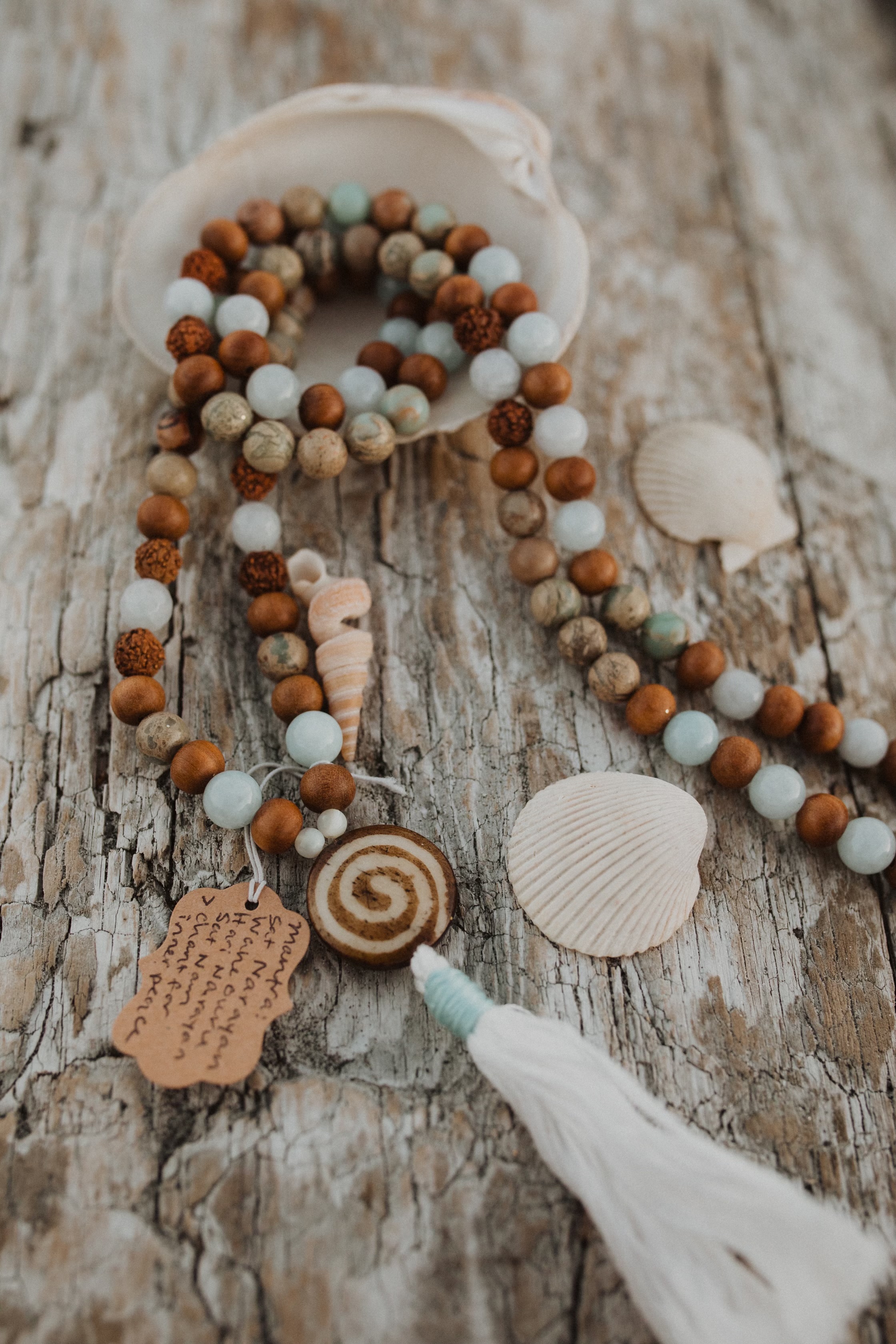 Mala bracelets and necklaces are created with base beads of sandalwood intermingled with healing crystals inspired by your intention and color insight. Each Mala is infused with Reiki healing energy and uniquely made for you.